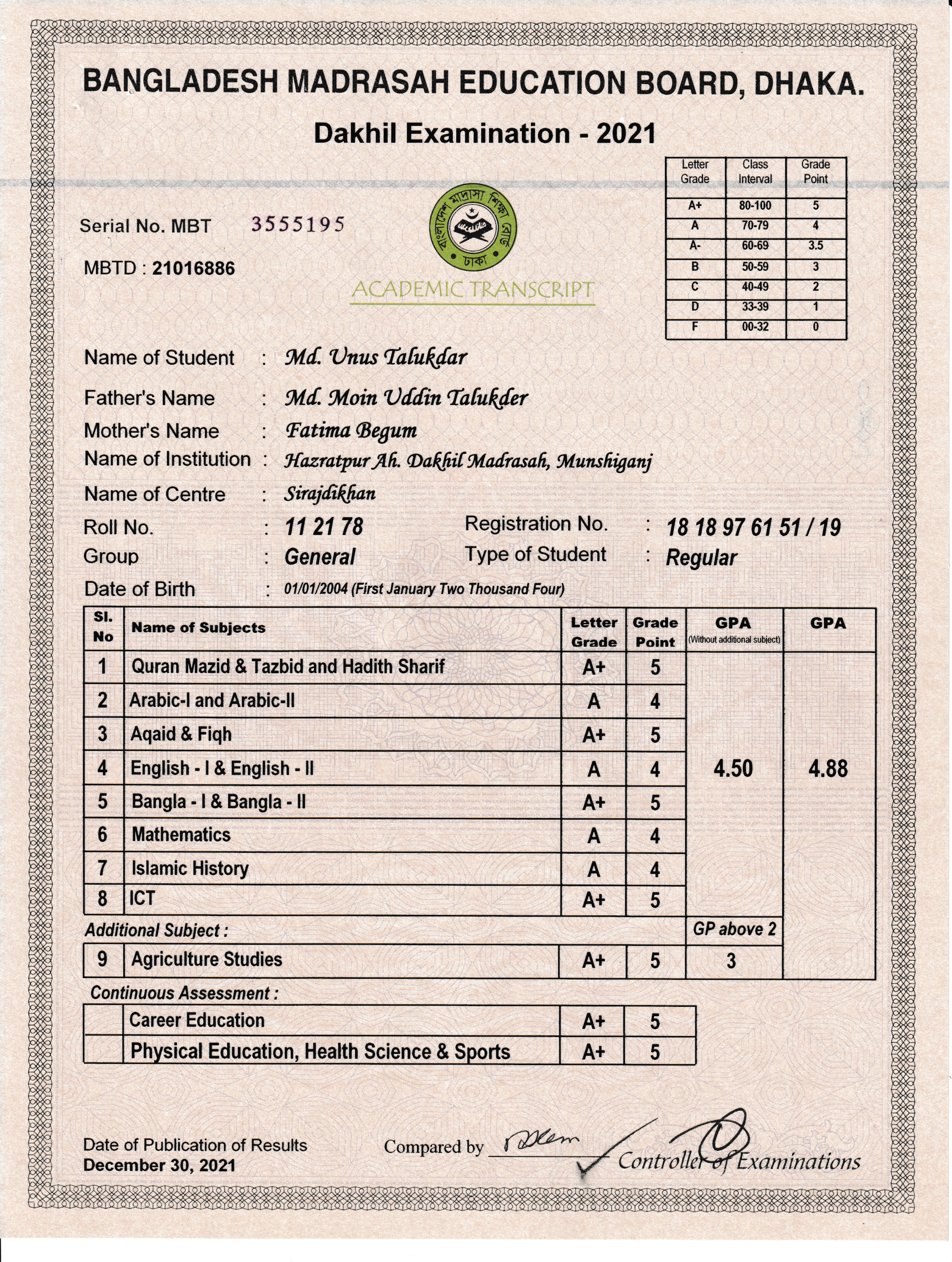 মাধ্যমিক স্কুল সার্টিফিকেটের সম্পূর্ণ ট্রান্সক্রিপ্ট। ৫.০০ GPA সহ সকল বিষয়ের বিস্তারিত মার্কশীট। বাংলাদেশ টেকনিক্যাল এডুকেশন বোর্ড থেকে অফিসিয়ালি সত্যায়িত। এই ডকুমেন্টটি সকল প্রাতিষ্ঠানিক কাজে ব্যবহারযোগ্য।